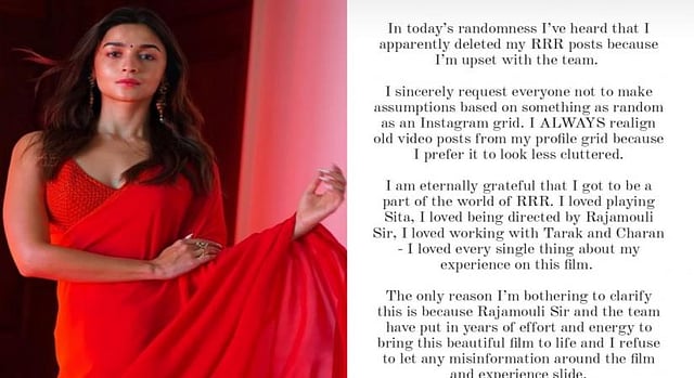 Alia Bhatt, who is rumoured to have deleted 'RRR' related Instagram posts after the movie's release, reacted with a lengthy note.