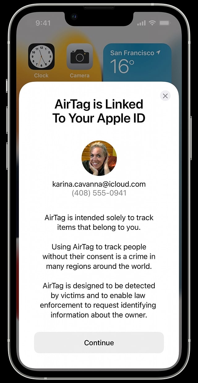 The warning alerts will make it clear that the AirTag is linked to an Apple ID, that using it to track people is a crime, and that law enforcement can request identifying information about the owner of the AirTag.