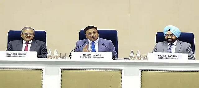 Chief Election Commissioner of India, Rajiv Kumar, Election Commissioners of India, Gyanesh Kumar and Dr Sukhbir Singh Sandhu addressed the press conference held in the Plenary Hall of the Vigyan Bhawan in the national capital.