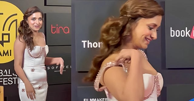 Jiya Shankar' wardrobe malfunction took place on Friday evening. Jiya Shankar OOP moment video was filmed when she was photographed at the Jio Mami Film Festival. Jiya looked stunning in a white strappy gown, but as she posed for photos, one strap slipped off her shoulders.