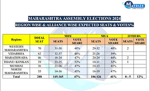 In terms of vote share, the ruling MahaYuti alliance is likely to hold sway over the Opposition. BJP-led alliance is likely to bag 47 per cent vote share while the Congress-led alliance is likely to garner 41 per cent vote share. Independent and others can expect to grab up to 12 per cent vote share.