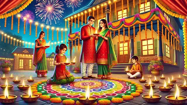 People celebrate this festival by lighting oil lamps, making rangoli, bursting firecrackers, exchanging gifts and worshiping Lord Ganesha and Goddess Lakshmi.