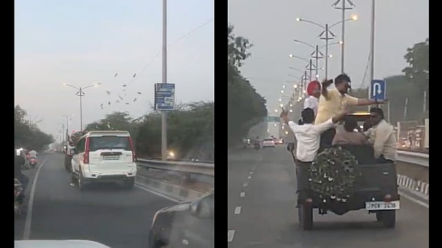 The 51-second viral video shows both the vehicles moving along the road, including an open modified jeep carrying five to six youths. As the vehicles move along, the youths can be seen dancing inside the jeep and pulling bundles of ₹10 notes from their pockets and tossing them into the air toward the Scorpio behind them.