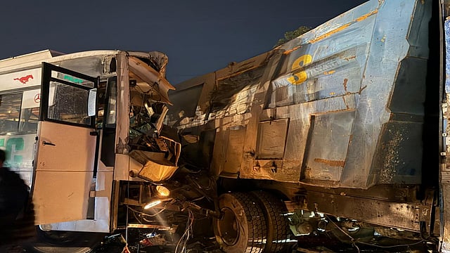 At that very moment, a BTC company private bus traveling at high speed from Pathankot to Amritsar, collided directly with the tipper. The impact was so severe that all the interior seats were ripped off and the front portion of the bus was completely crushed.
